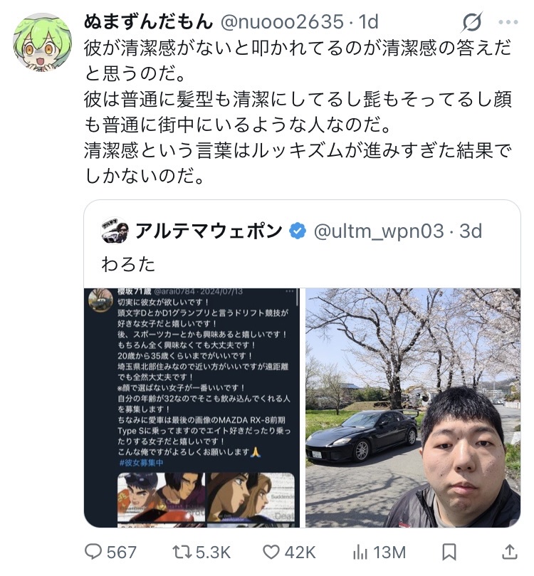 この青年は清潔ではあってもまんさんにとっては清潔感ないと見なされてしまうわけ