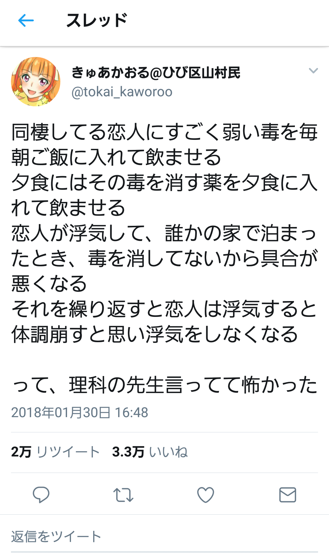 (ヽ’ん`)「同棲してる恋人の朝食にすごく弱い毒を混ぜる。夕食にその毒を消す薬を混ぜる」