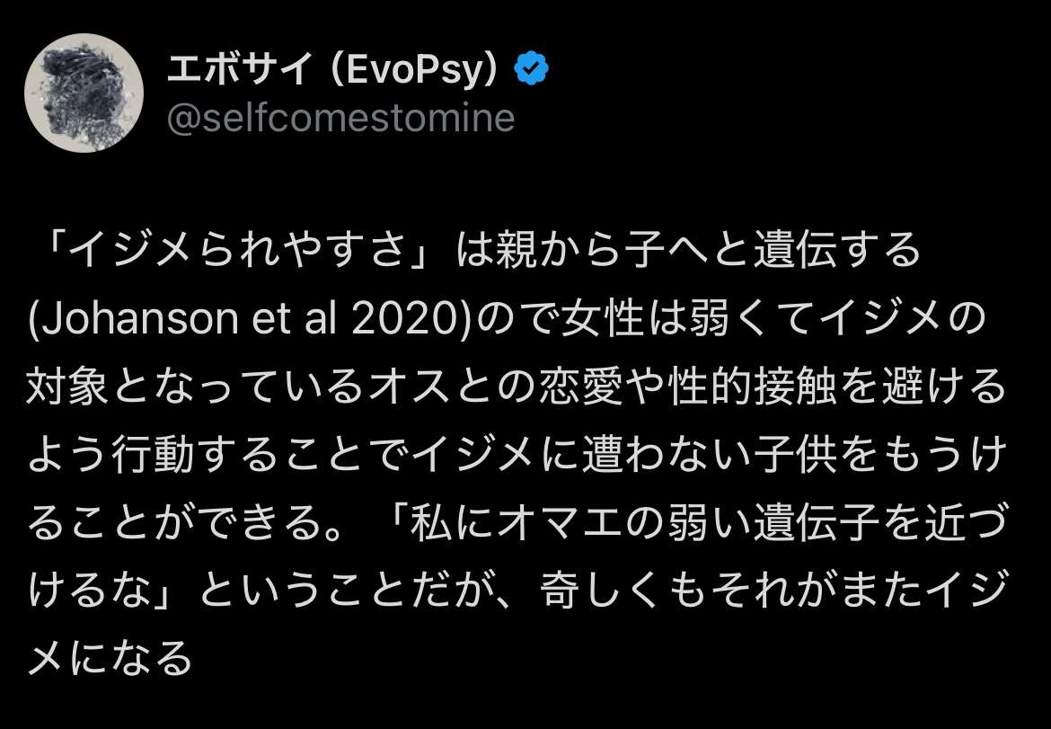 いじめられるような弱男は子孫残せないんだから遺伝以前の問題やろ