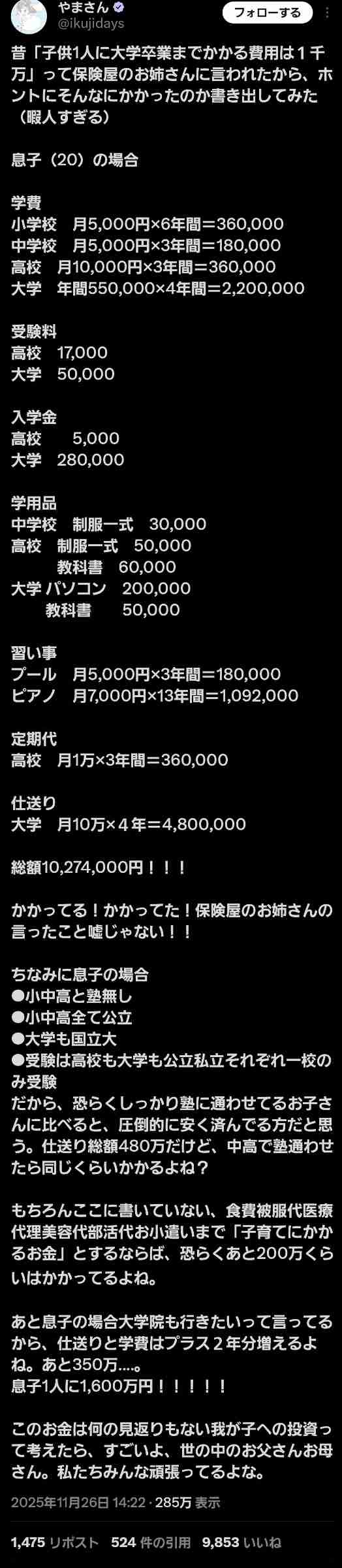 昔「子供1人に大学卒業までかかる費用は1千万」って保険屋のお姉さんに言われたから、ホントにそんなにかかったのか書き出してみた(暇人すぎる)