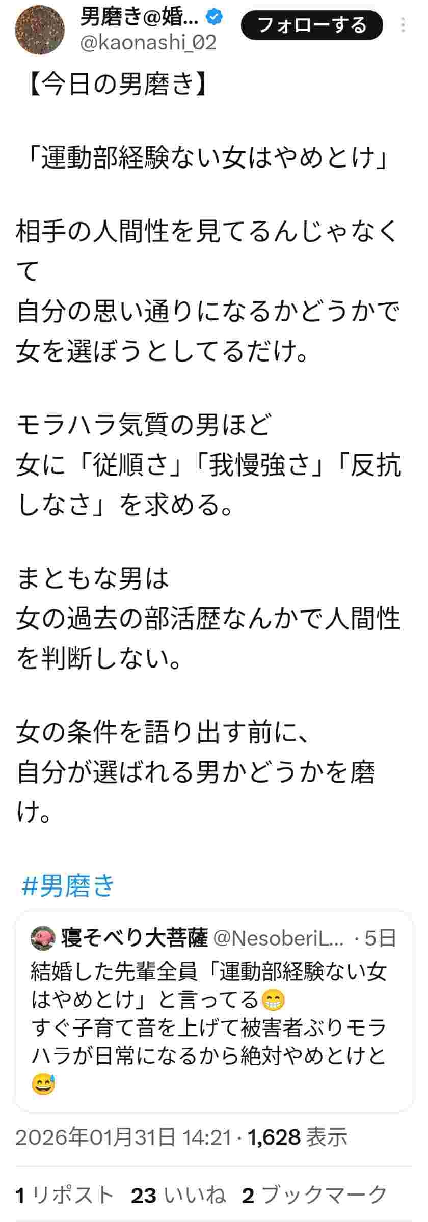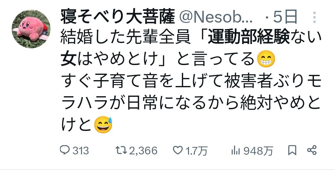 運動部経験ある女はチー牛選ばないし自然と似たようなスポーツ男とくっつく