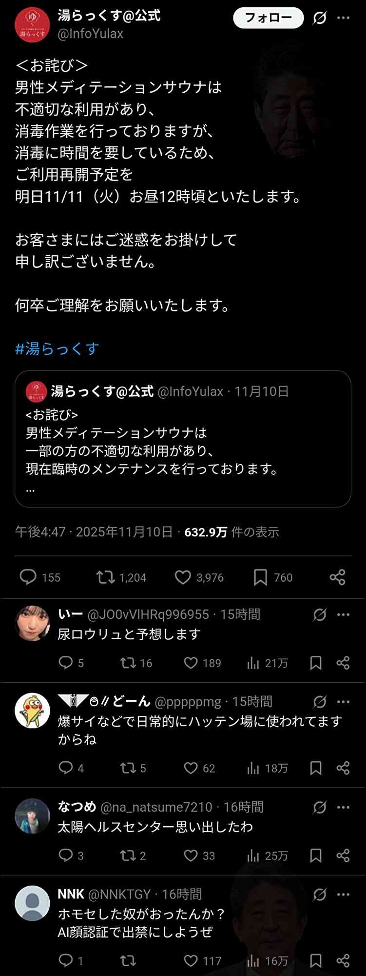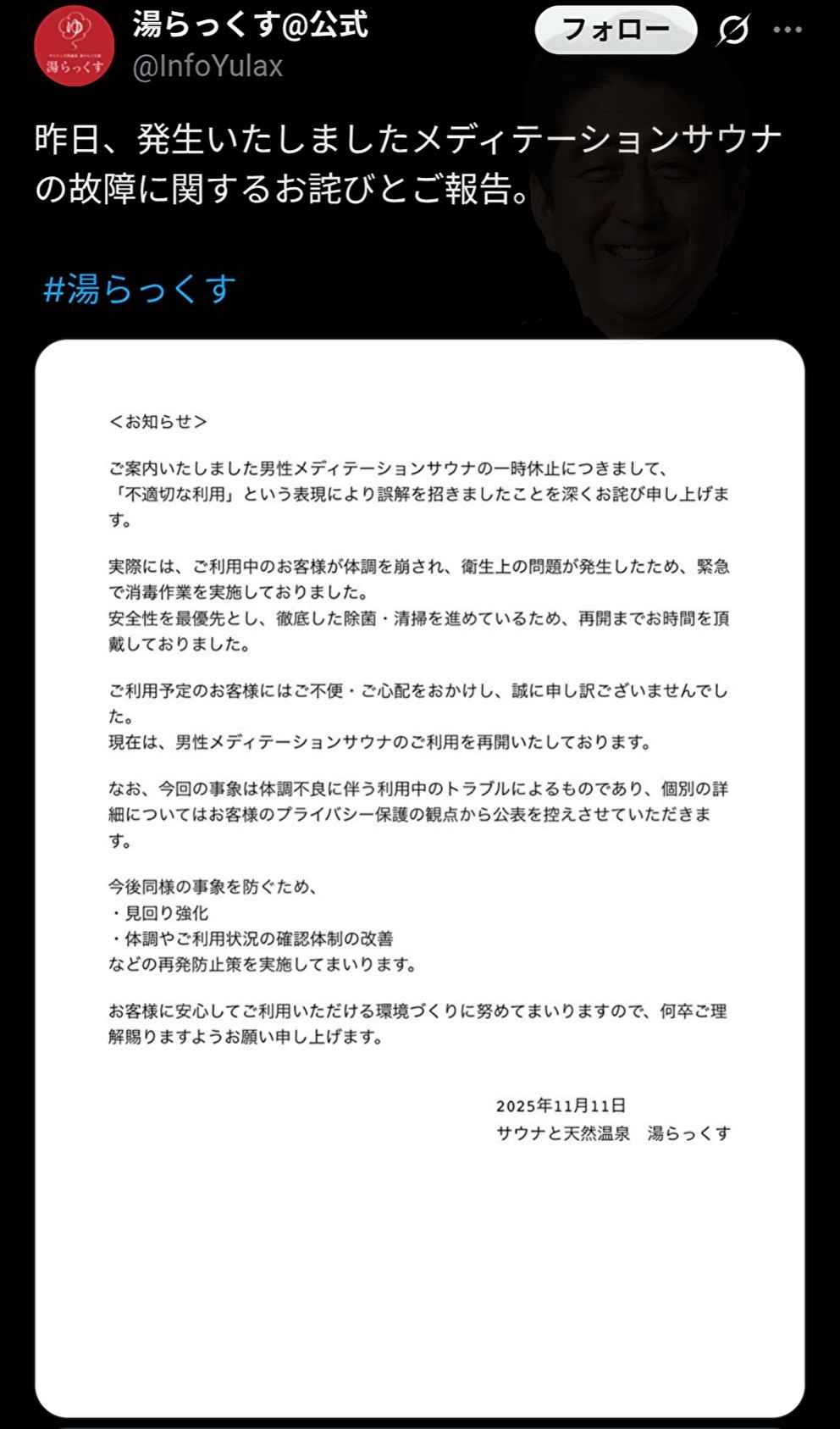 ♨「男性サウナで不適切な利用がありました」👉謝罪へ