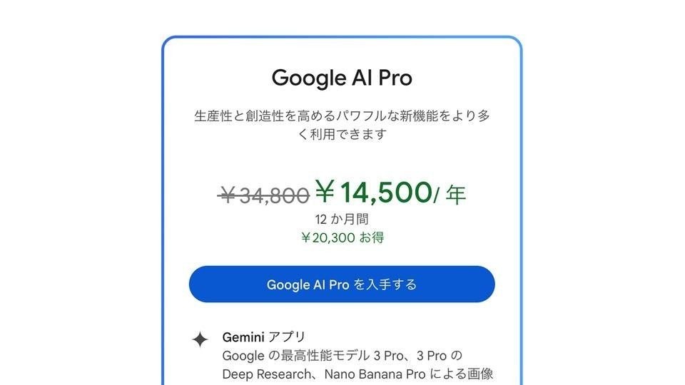 驚異の58%オフ、2万円引き。Googleの「最強AI使いまくりプラン」がセール中