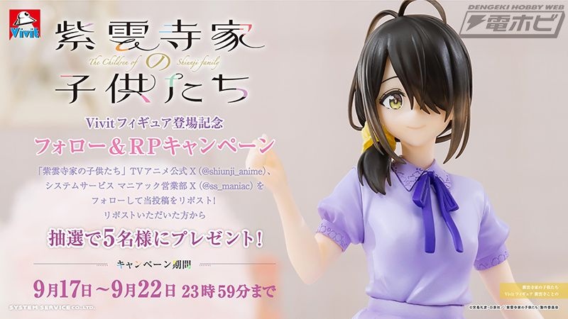 プライズ登場を記念して、抽選で5名に「紫雲寺家の子供たち Vivitフィギュア 紫雲寺ことの」が当たるフォロー&リポストキャンペーンを実施。9月17日(水)から9月22日(月)23時59分までの期間、「『紫雲寺家の子供たち』TVアニメ公式Xアカウント(@shiunji_anime)」と「システムサービス マニアック営業部(@ss_maniac)」の両方をフォロー、該当ポストをリポストすることで抽選に参加できます。