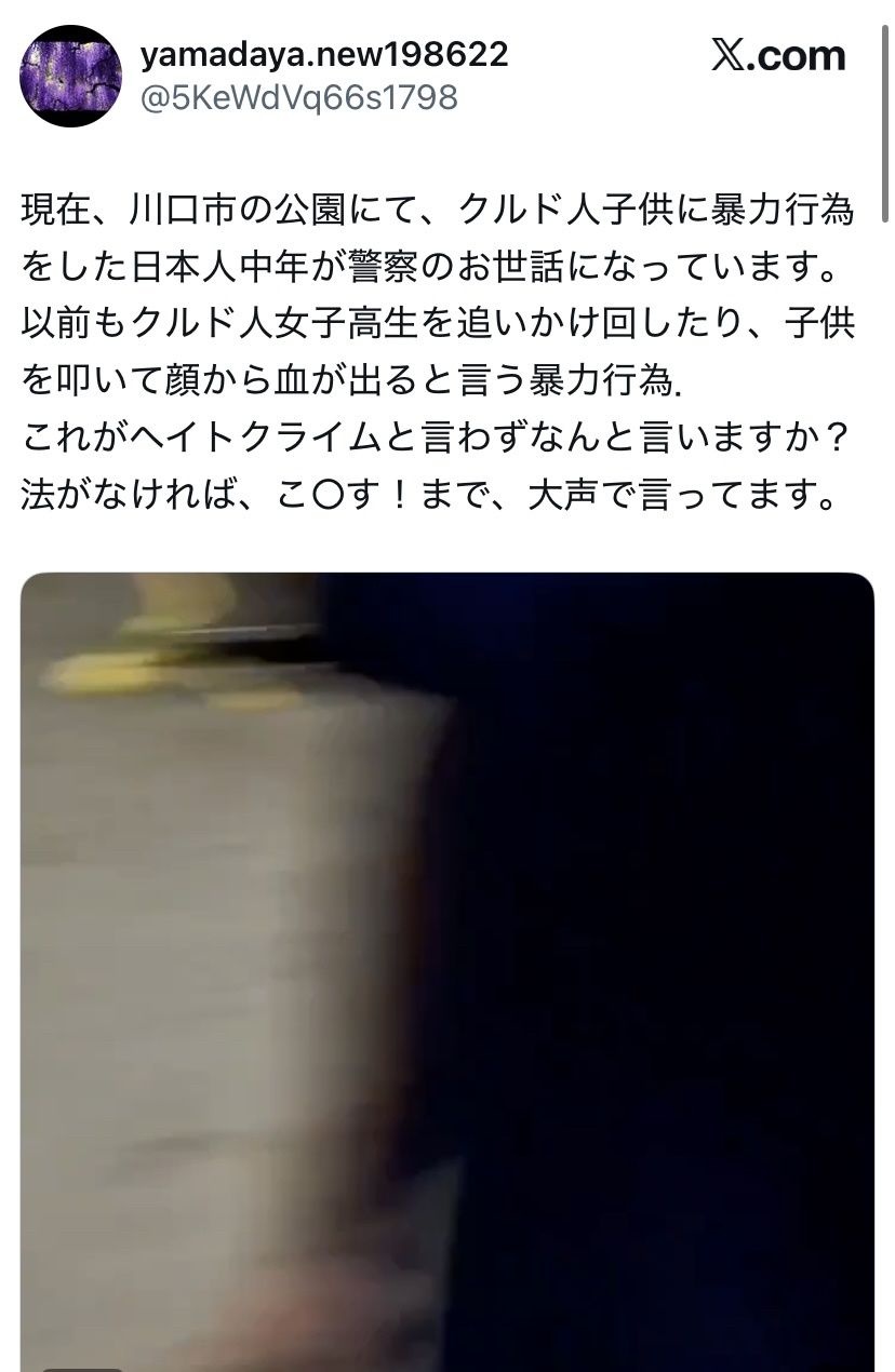 現在、川口市の公園にて、クルド人子供に暴力行為をした日本人中年が警察のお世話になっています。