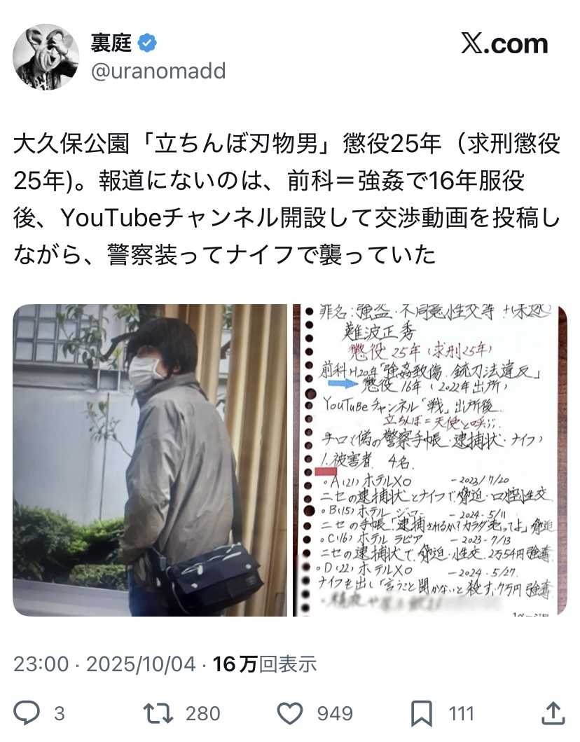 新宿・歌舞伎町の大久保公園付近で街頭に立ち、売春の客待ちをする「立ちんぼ」の女性4人を脅し、金品を奪ったりわいせつな行為をしたりしたとして、不同意性交や強盗の罪に問われた東京都三鷹市の理容師、難波正秀被告(62)の裁判員裁判で、東京地裁(新井紅亜礼(くあら)裁判長)は22日、懲役25年(求刑懲役25年)の判決を言い渡した。