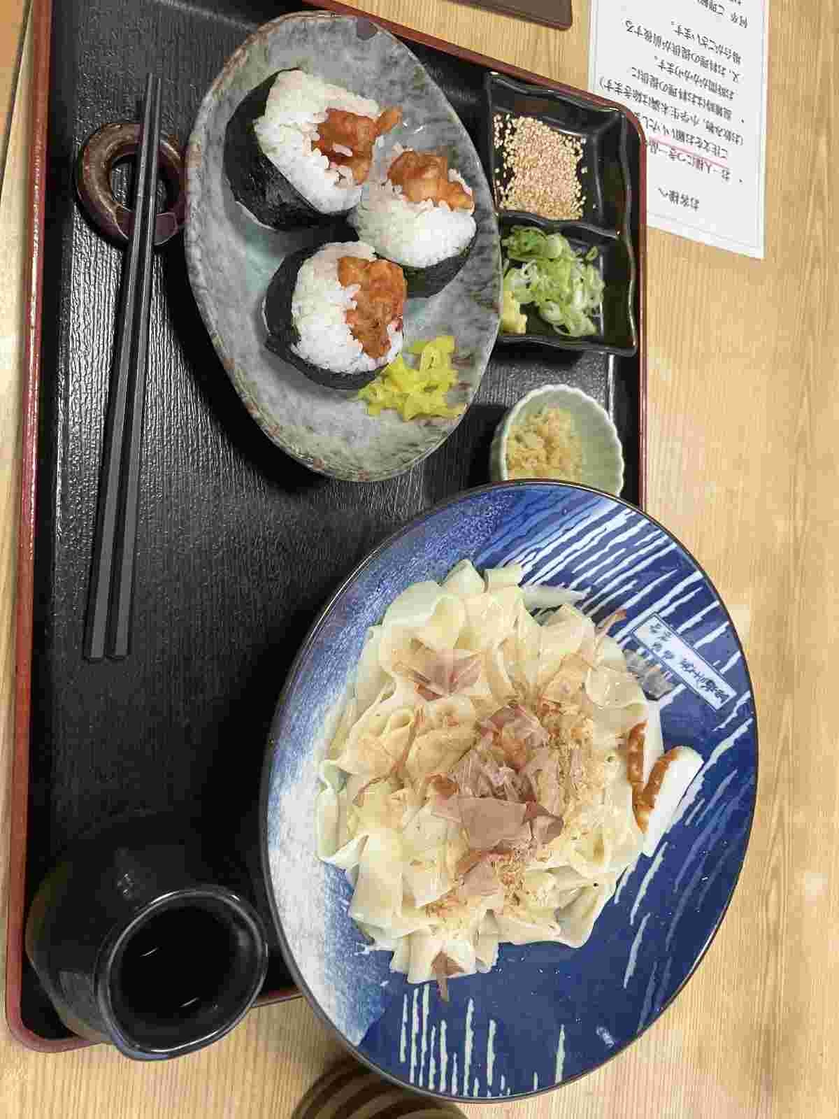 きしめんにデカいおにぎり(握り拳くらいの天むす)3つついて770円