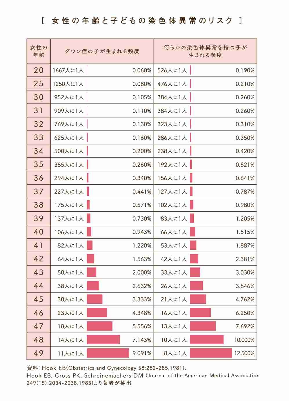 【画像】女性の出産年齢と染色体異常のリスク率がコチラwww