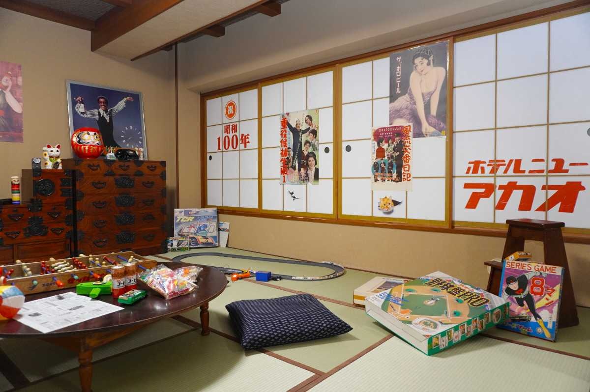昭和夜ふかしルームは、ホテルニューアカオの宿泊棟「オーシャン・ウィング」8階にある特別室ジュニアスイート(和室2+ベッドルーム1、83m2)を利用。3間あるうちの和室1間に“昭和の趣味部屋”を再現している。