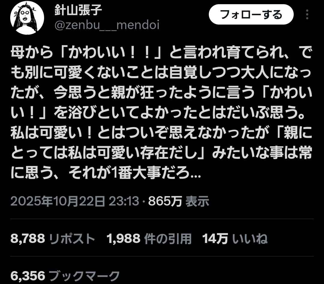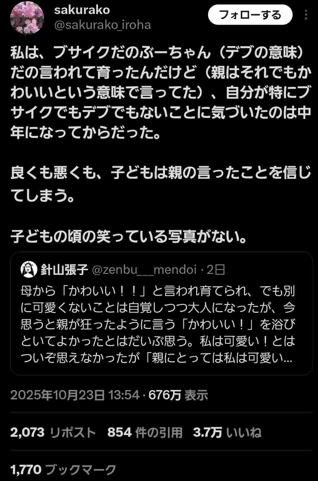 ちなみに親に本当に愛されて育った人間は他人の痛みに共感する能力も育つから、お前みたいにはならないと思うよ