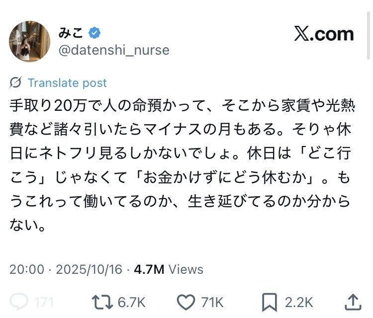 今20万の手取りで人の命を預かるのが辛いって言ってんだよこの糞老害