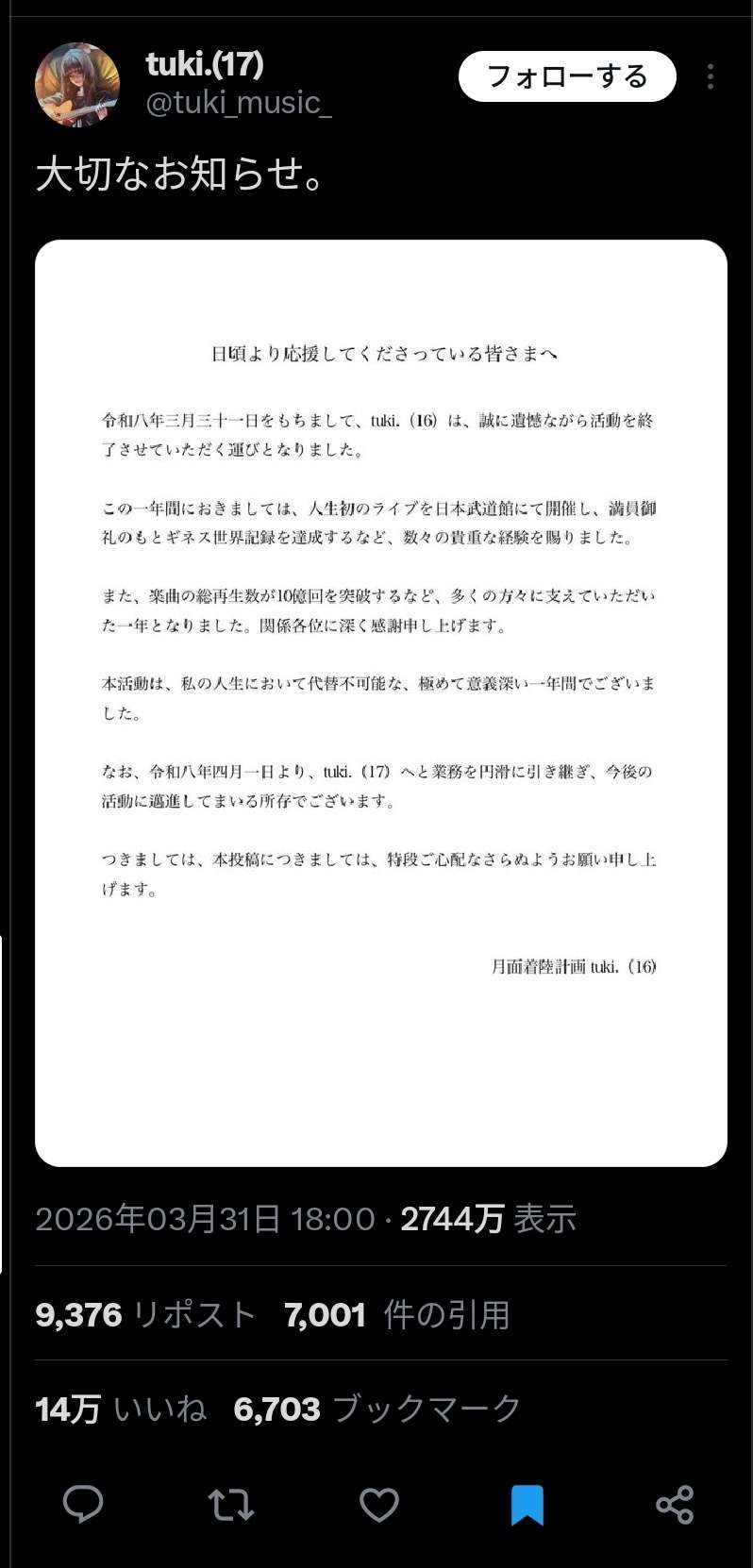 【高市訃報】tuki.(16) さん、引退 【 NOT エイプリルフール】