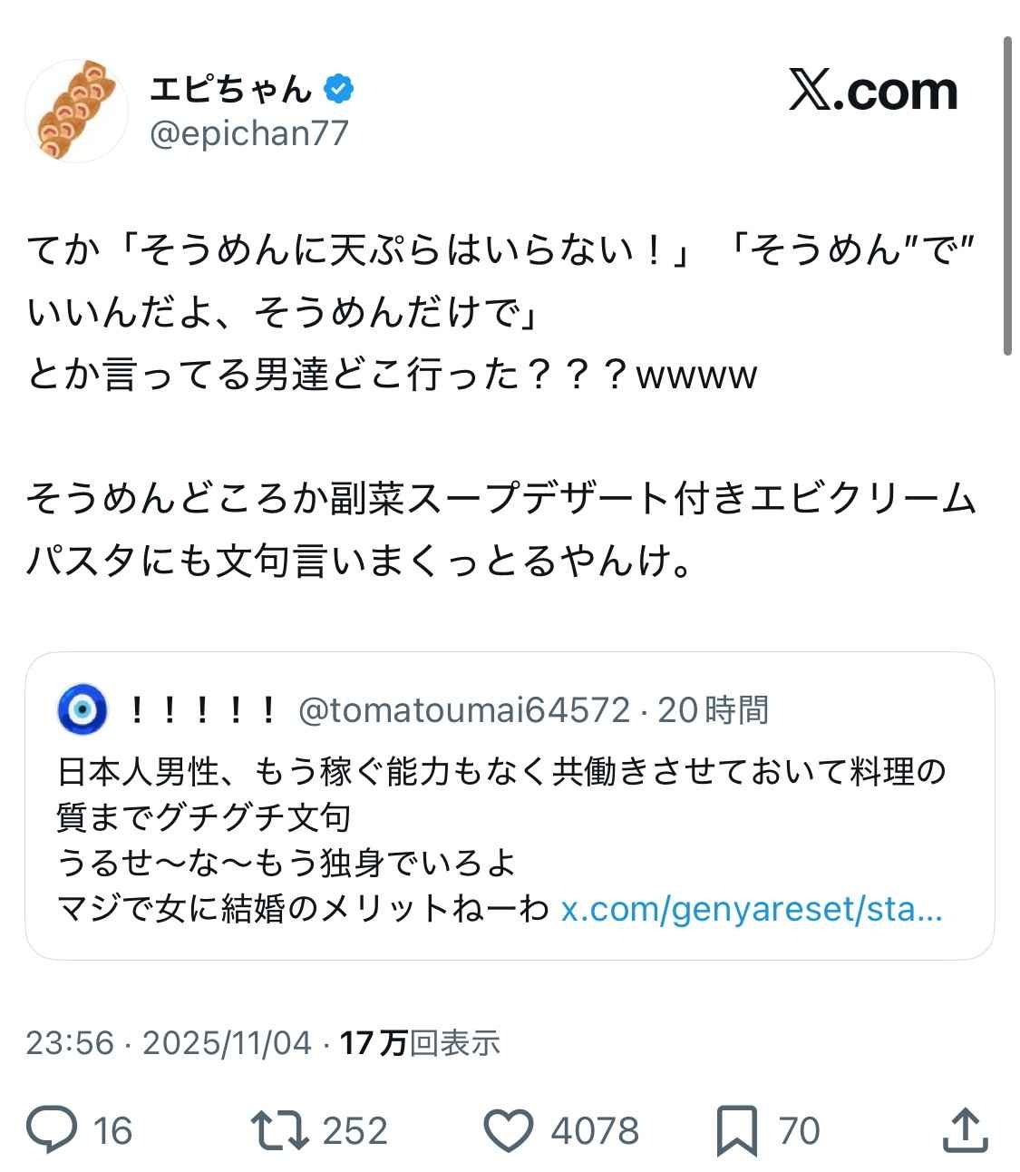 わりとマジで男の天井知らずのわがままさに悩むぐらいなら一生独身の方がいいって女が増えてるだろうな