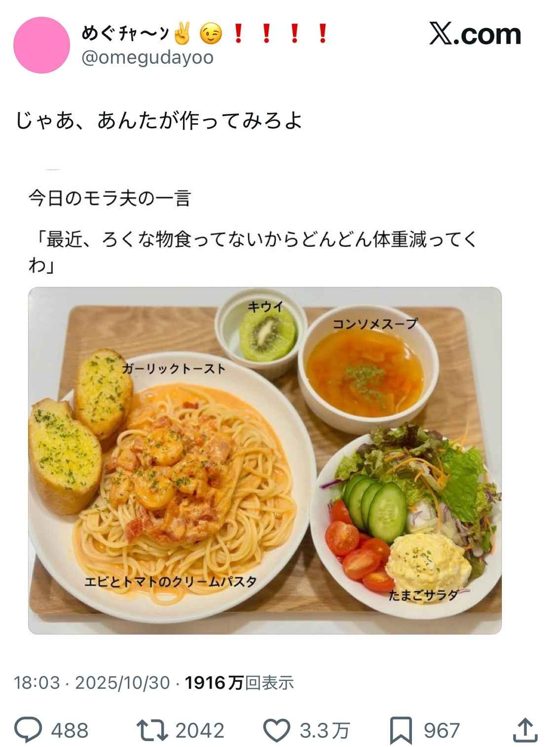 「作らなくていいよ」が嘘で「質素な料理は嫌だ」が本音なのが最初から見抜かれてるから燃えたわけよ
