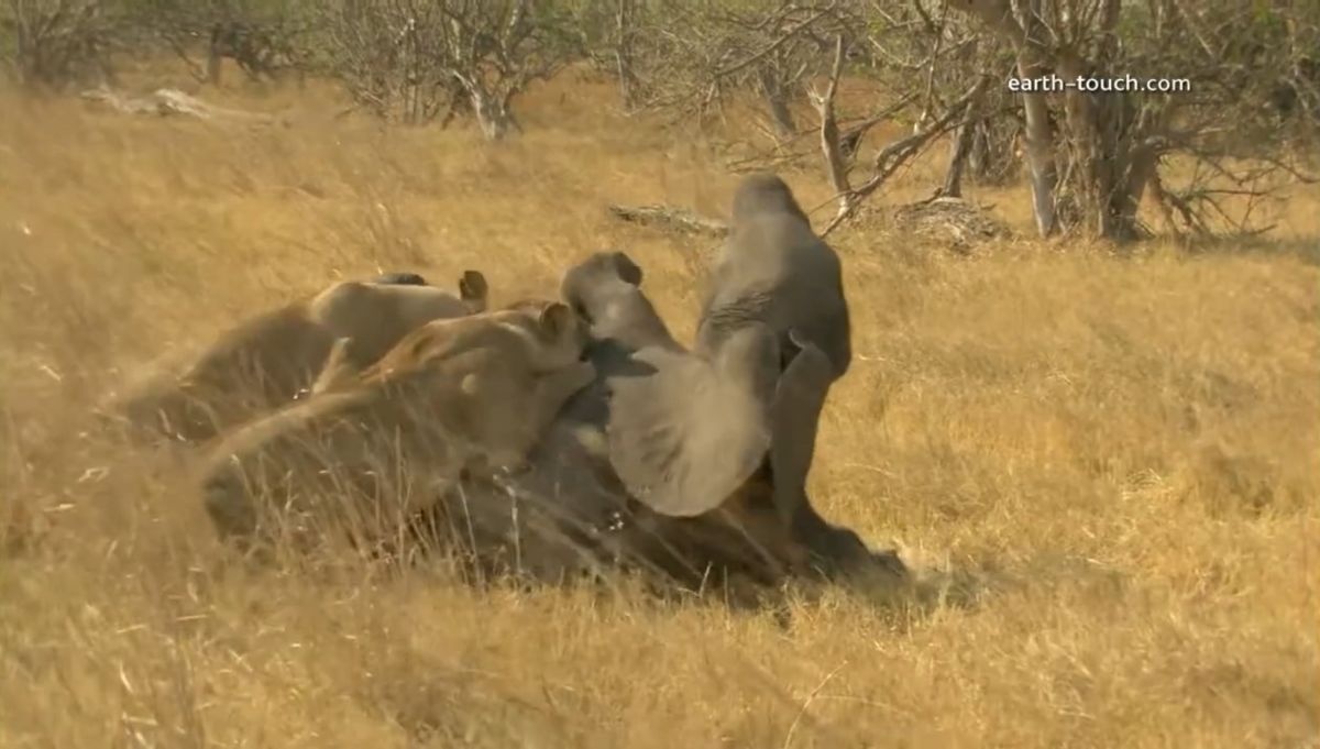 ライオンの群れに食べられながら、泣き叫んでいるアフリカゾウの子供