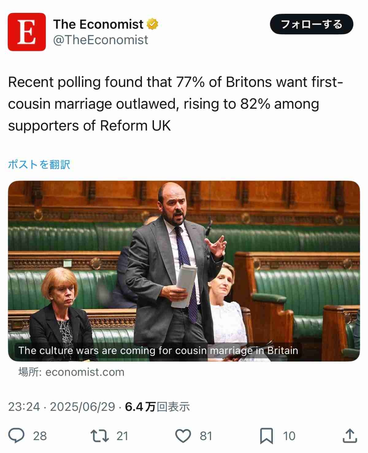 最近の世論調査によると、英国人の77%がいとこ同士の結婚を禁止することを望んでおり、改革英国支持者の間では82%に上昇している。