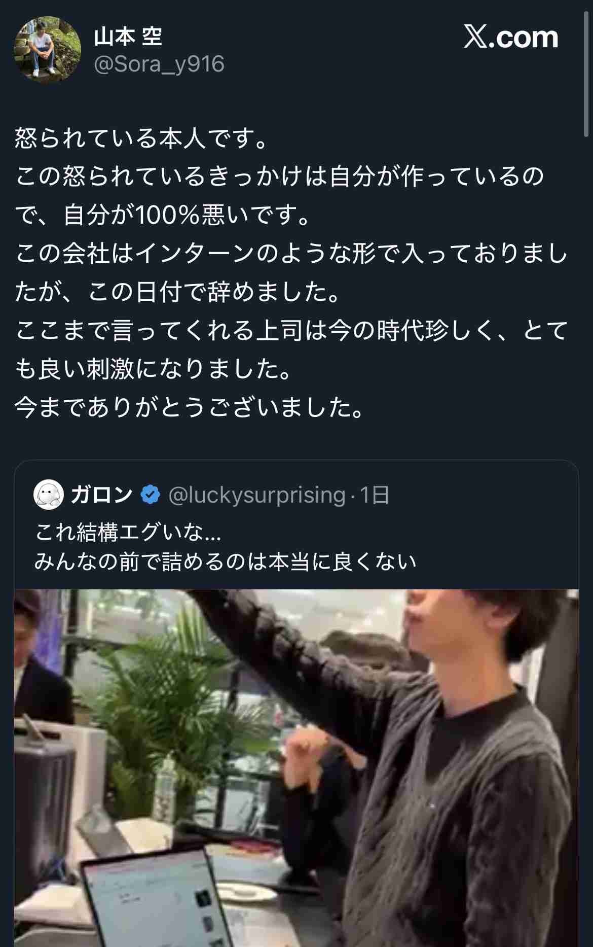 いやーこれは昭和世代でもなかなか味わえないパワハラですなーインターンでこんなの食らったらマジ病む可能性高いわ時代関係ないねすごいなこのパワハラしてる人こんな会社が今でも存在することに驚きを隠せませんわ何ていう会社か知らんけどまぁ頑張って稼いでよって感じ被害者の男の子は早めにブラックな会社を経験できてこれを糧にまともな会社を見つけてねって思うわ