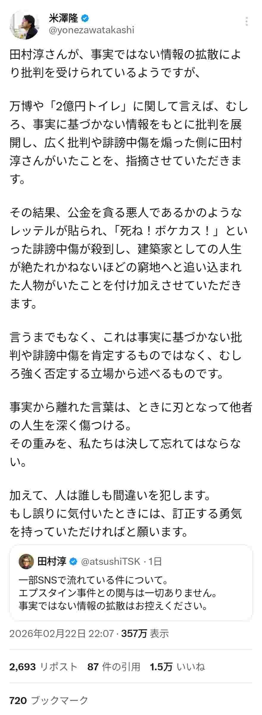 エプスタイン疑惑でデマに苦しむ田村淳さん、万博二億円トイレの設計士に死体蹴りされる