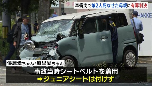 判決などによりますと、古賀千尋被告(33)は去年8月、福岡市早良区で軽乗用車を運転中、路線バスと衝突。後部座席に乗っていた娘の優麗愛ちゃん(7)と麻里愛ちゃん(5)を死亡させたほか、バスの乗客など4人にけがをさせました。