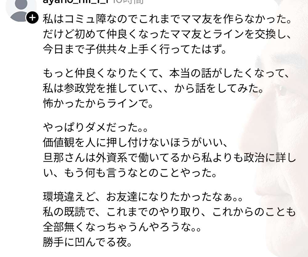 「景気悪いっすねー」「物価高いっすねー」みたいな話なら全然いいけど○○党はどこどこが素晴らしいとか外国人ヘイトの話をする連中とは距離を取ったほうがいいね
