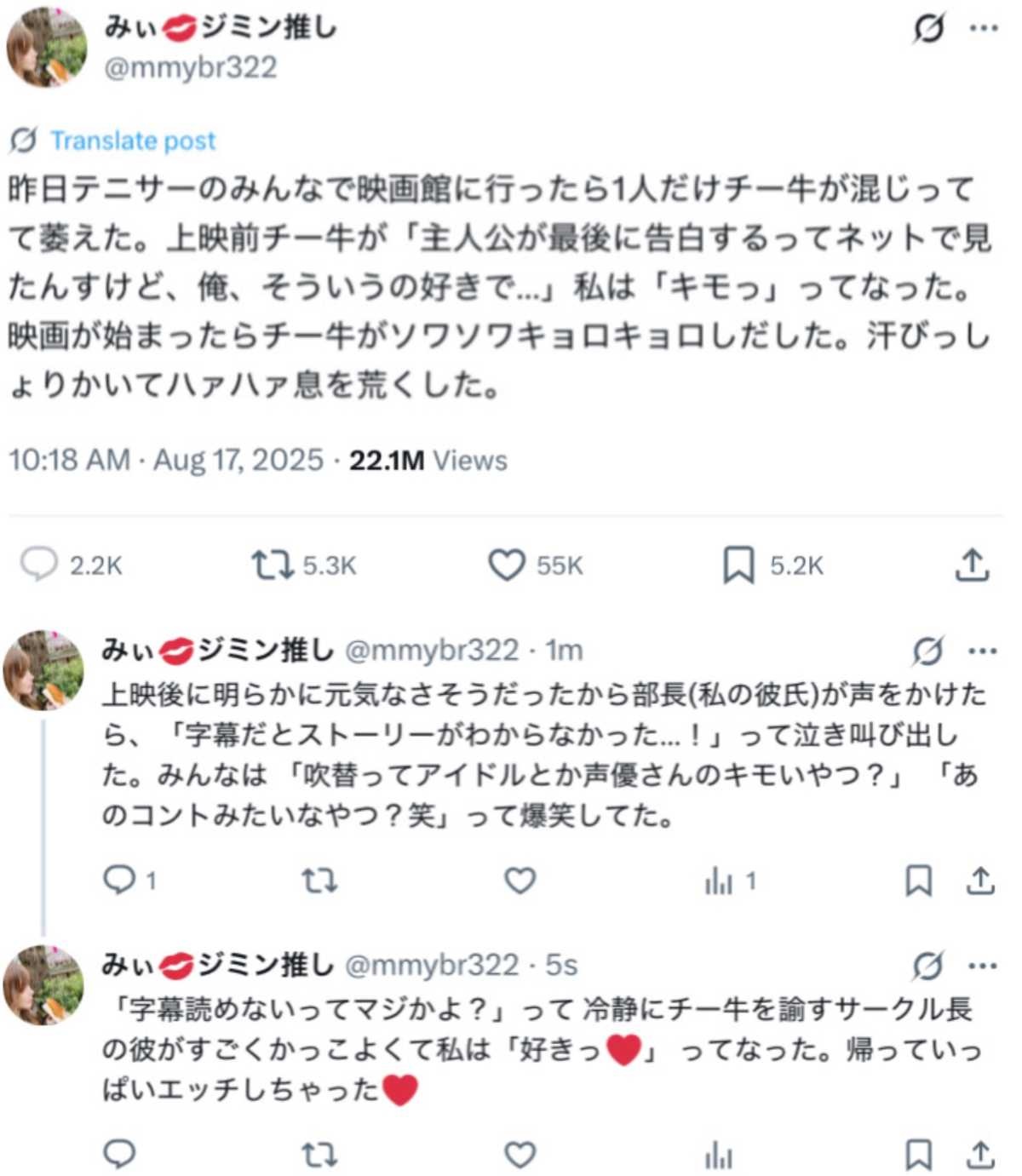 上映後に明らかに元気なさそうだったから部長(私の彼氏)が声をかけたら、「字幕だとストーリーがわからなかった…!」って泣き叫び出した。みんなは 「吹替ってアイドルとか声優さんのキモいやつ?」 「あのコントみたいなやつ?笑」って爆笑してた。