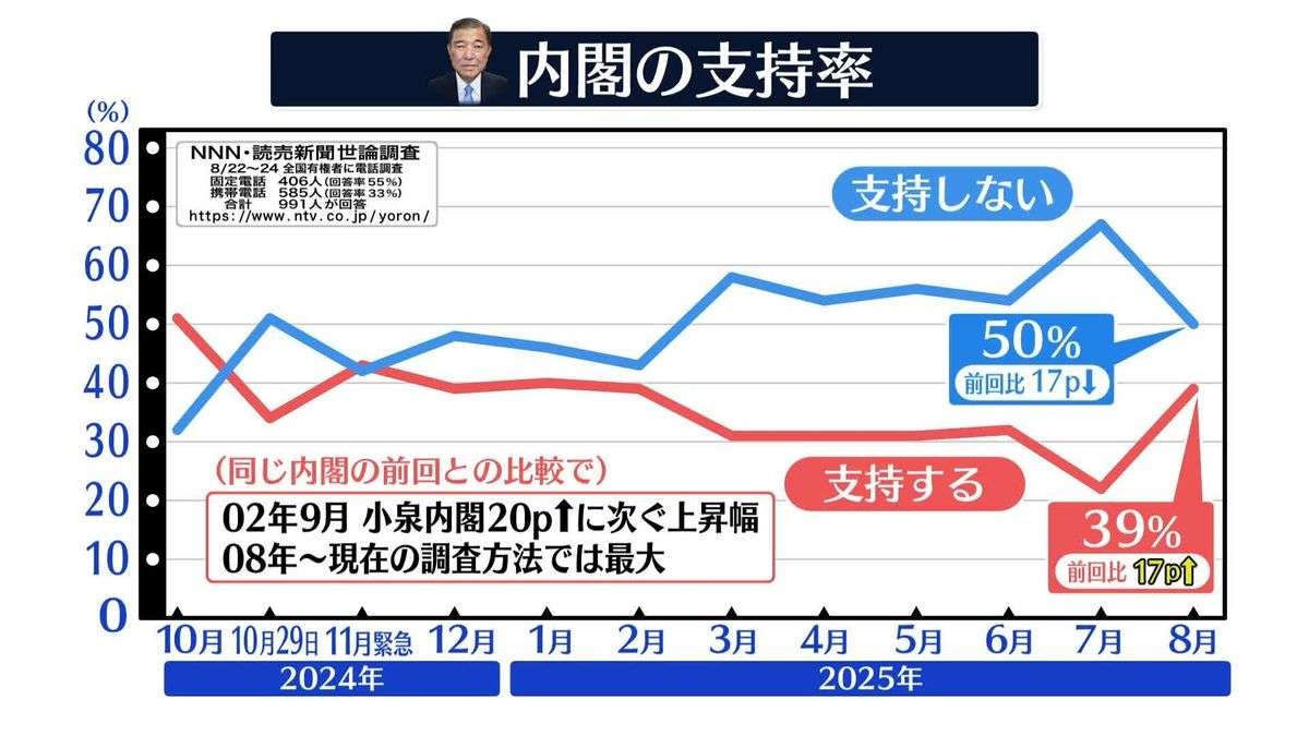 石破内閣支持率17ポイント上昇、39%に 自民支持層「石破首相辞任すべきと思わない」74% 【NNN・読売新聞 世論調査】