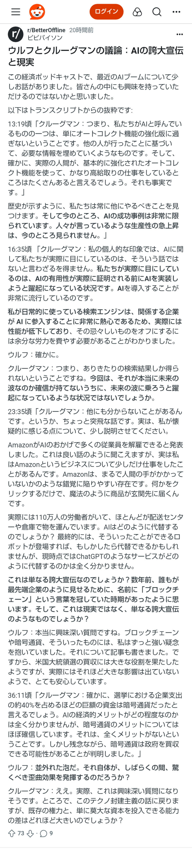 ただの入力補完の強化版とはいえ膨大なデータを学習させれば百科事典の代わりになるのだから、それはそれで凄い技術だとは思うけどね - 25 : 2025/06/25(水) 13:40:58.82 ID:MMZ+oyT20