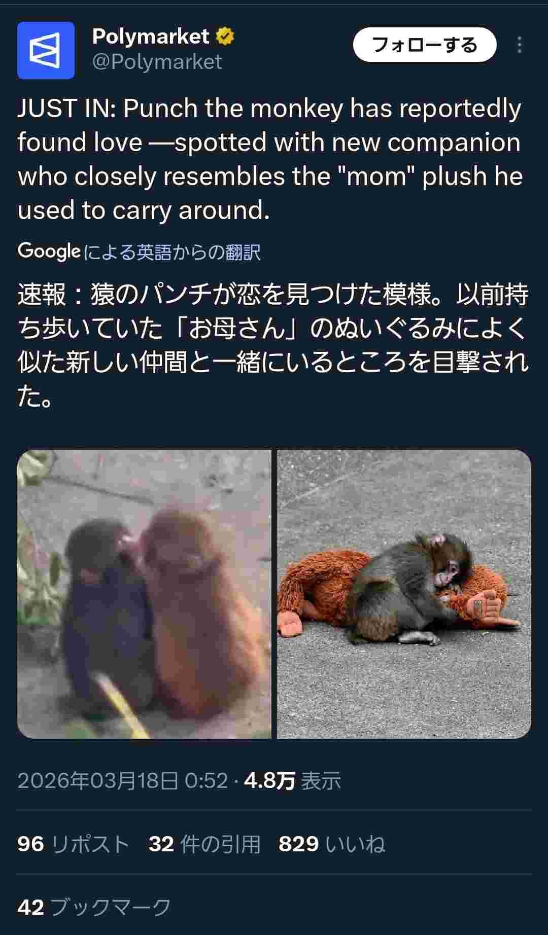 パンチくん(サル)、お母さんぬいぐるみに似ている年上のメス猿に恋してしまう…
