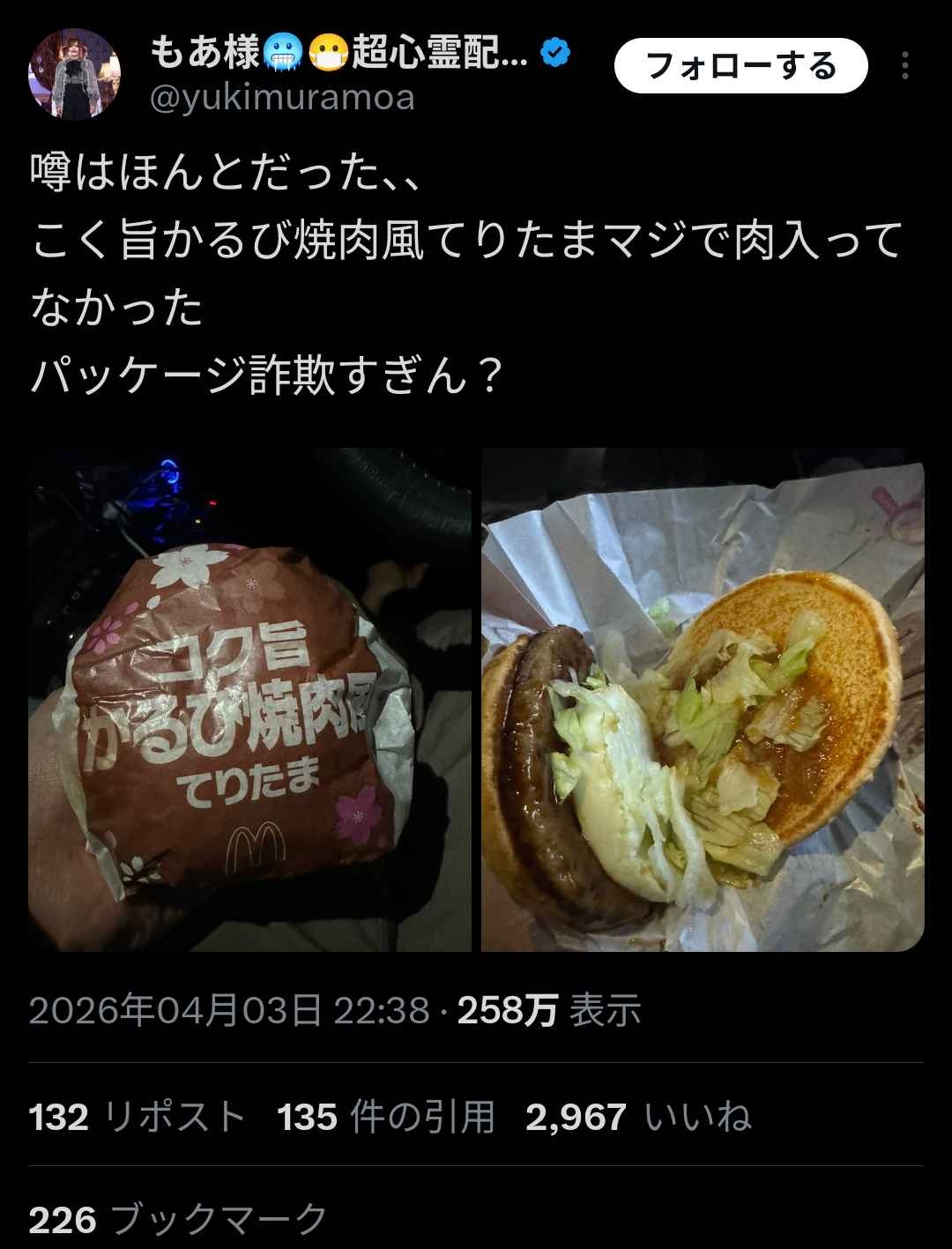 マクドナルドのカルビ焼肉風てりたま、肉無しパッケージ写真詐欺を行い炎上www