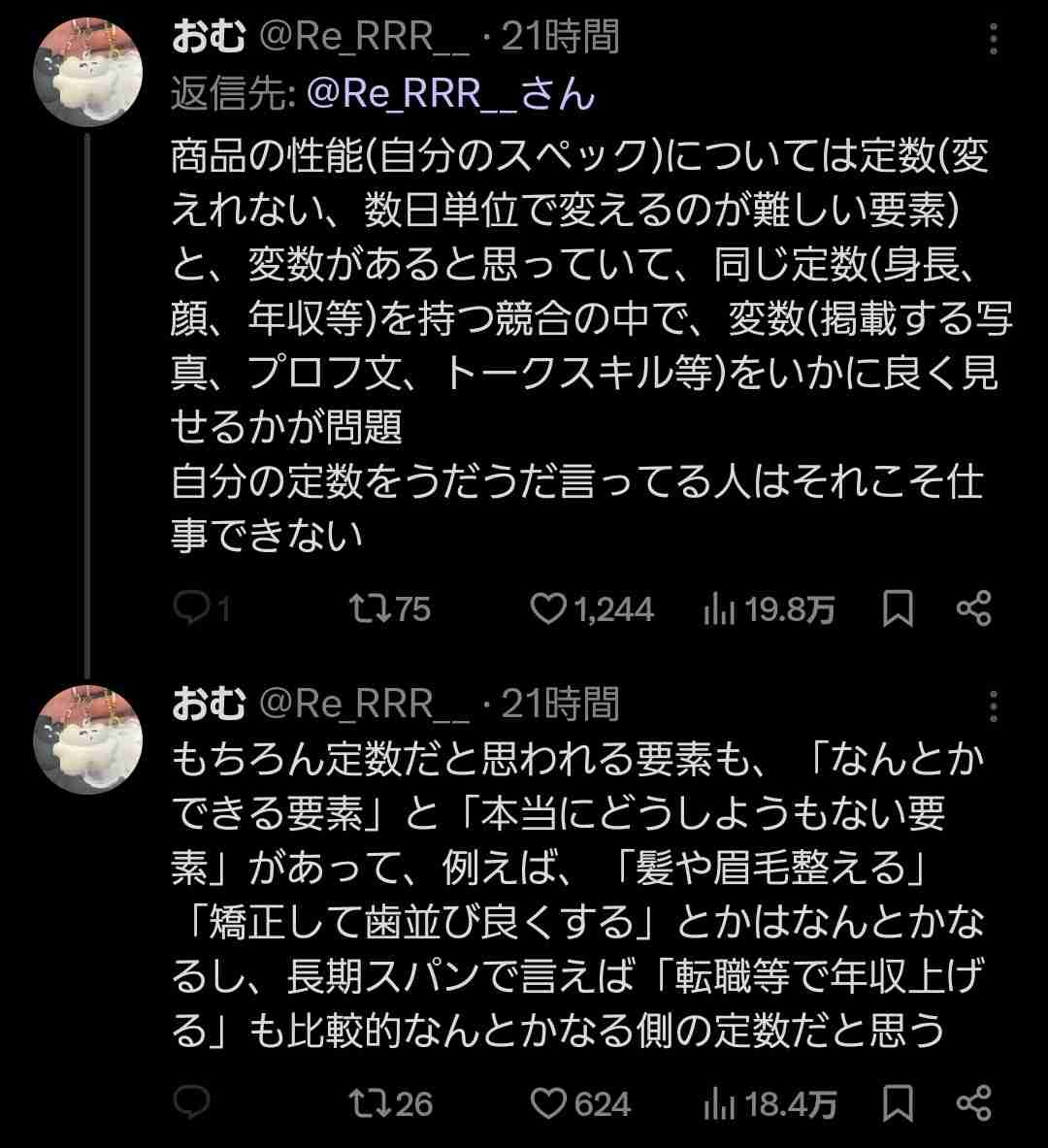 商品の性能(自分のスペック)については定数(変えれない、数日単位で変えるのが難しい要素)と、変数があると思っていて、同じ定数(身長、顔、年収等)を持つ競合の中で、変数(掲載する写真、プロフ文、トークスキル等)をいかに良く見せるかが問題