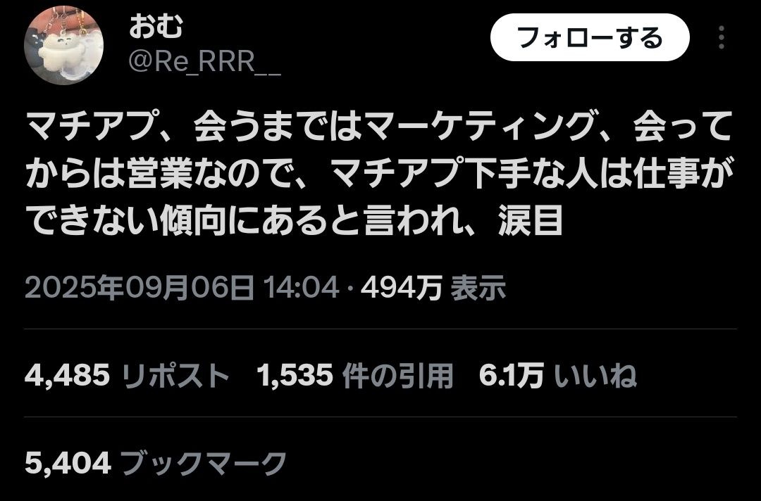 マチアプ、会うまではマーケティング、会ってからは営業なので、マチアプ下手な人は仕事ができない傾向にあると言われ、涙目