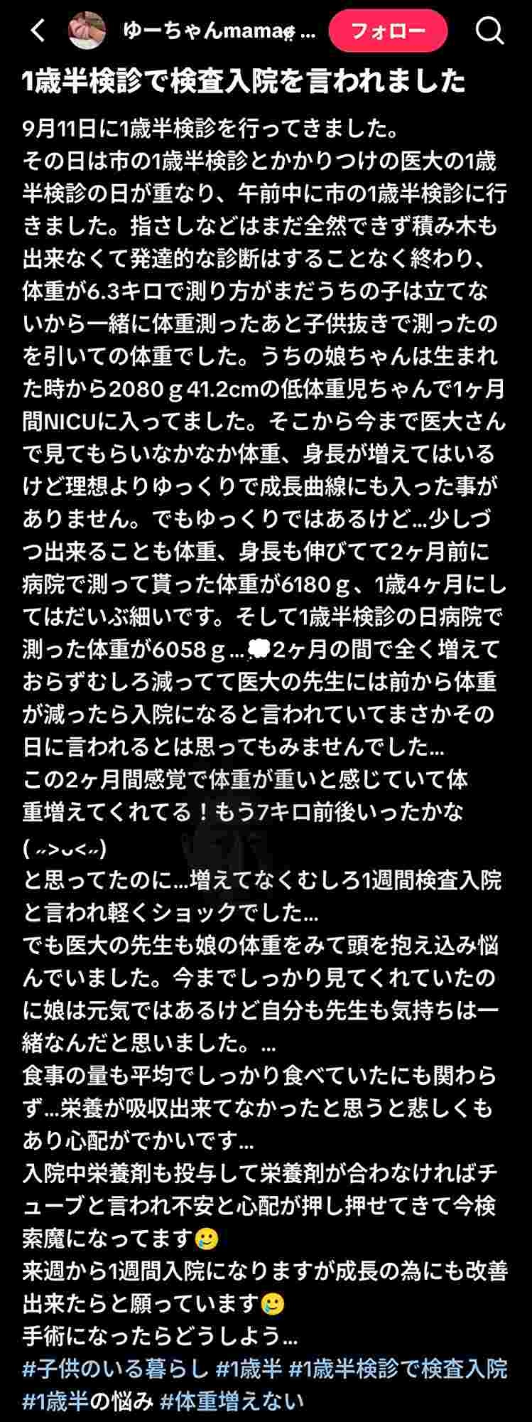 子どもの1歳半検診に行ったら、子どもの体重が減っていて検査入院になった。心配だ。