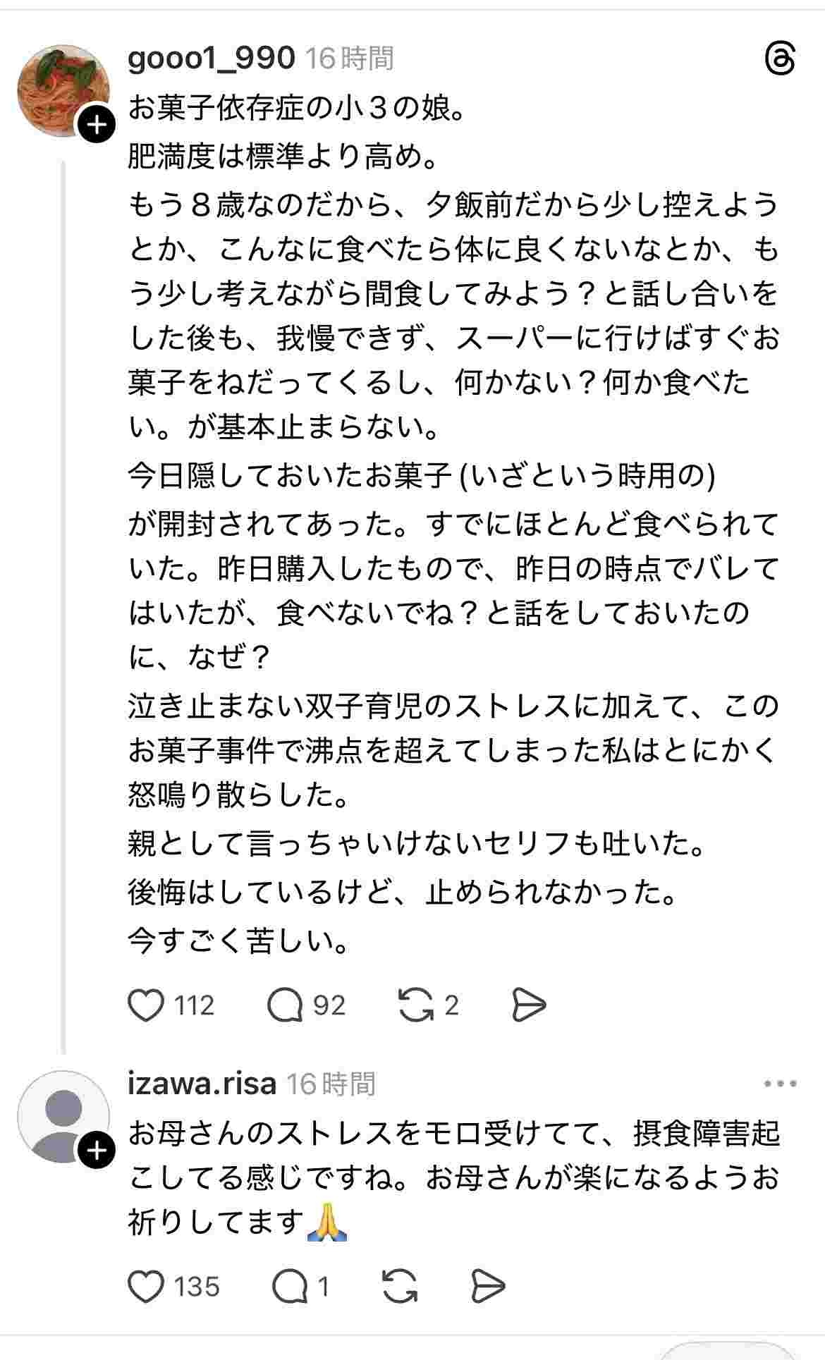 たとえばポテチを開けて、半分だけにしとこうと思ったのについ全部食べちゃった、くらいならわかるけど、隠しておいたのを食い尽くすのは異常だよ