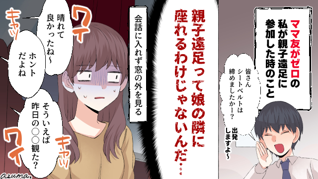 2025年6月13日 11時28分 Googirl「ママ友0人の私が幼稚園の親子遠足に参加したときのこと。てっきりバスでは娘の隣に座れると思いきや、子どもたちと親は別々の席……。親たちはバスの後ろの方に座っていたのですが、周りはママ友グループがすでにできていて、私だけぼっち……。そんな気まずい状況なのに、マジカルバナナをみんなでやろうと先生が言い出して、なんだか、学生時代にグループ分けで余ったときのことを思い出してつらかったです(笑)。