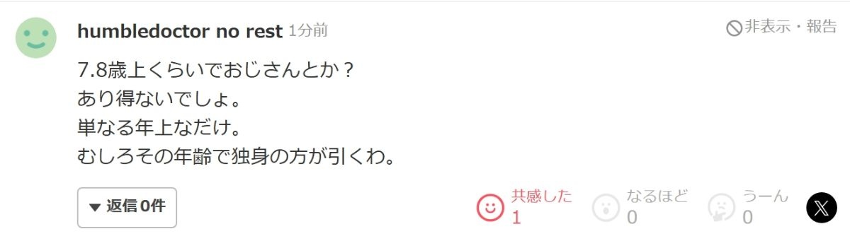 ヤフコメ民「7~8歳くらい年上なだけでオジサン扱いとかありえないでしょ。単なる年上なだけ」