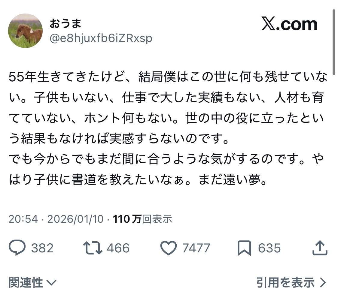 (ヽ´ん`)「55年生きてきたけど、結局僕はこの世に何も残せていない。子供もいない、仕事で大した実績もない」ここから逆転する方法