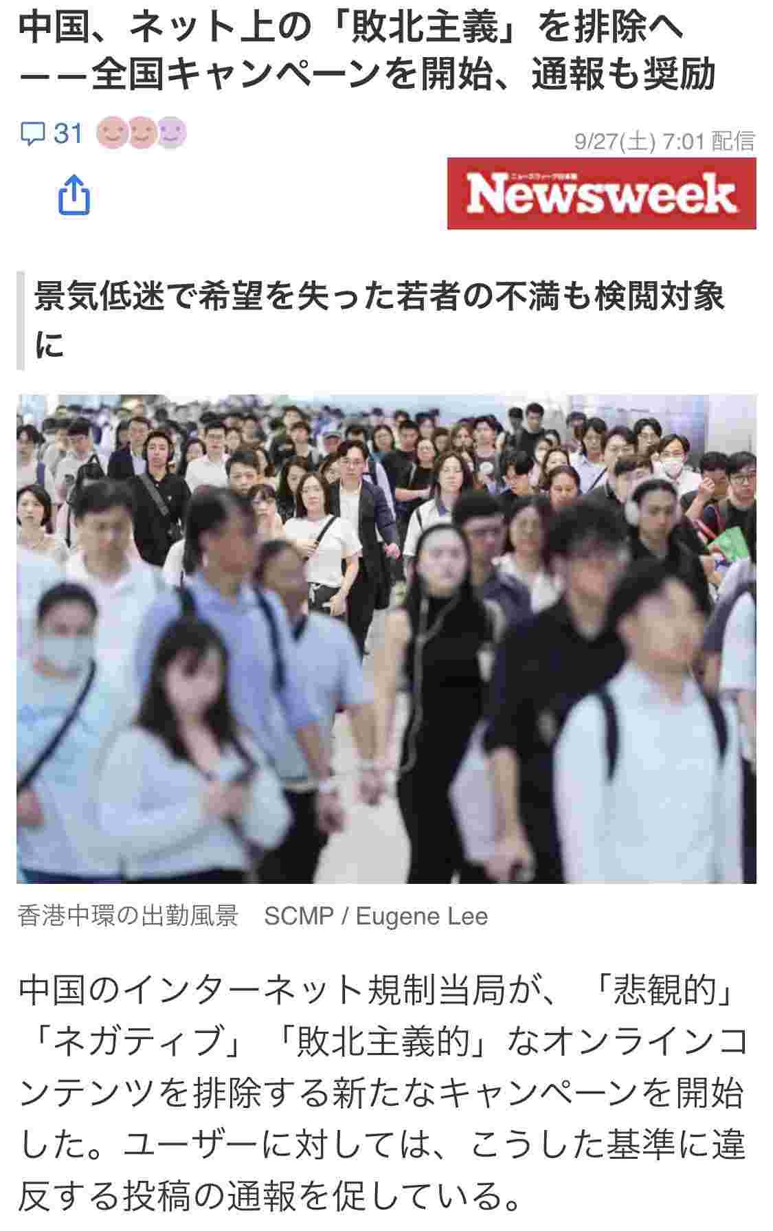 中国のインターネット規制当局が、「悲観的」「ネガティブ」「敗北主義的」なオンラインコンテンツを排除する新たなキャンペーンを開始した。ユーザーに対しては、こうした基準に違反する投稿の通報を促している。