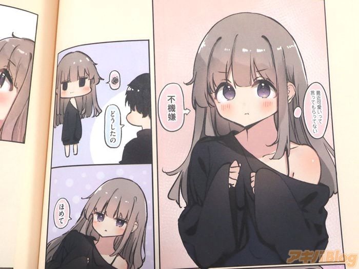 「二歳くらい年上のこんな彼女が欲しい」【AA】は、カバー折り返しの作者プロフィールによると『2019年頃より本作をSNS上で発表。“こんな瞬間あったらいいな”を絵に閉じ込め、彼女ちゃんの可愛らしい仕草や表情に、Xをはじめ、SNS上で人気を集めている』という、asato氏が自身のTwitterやpixivなどで公開されているイラスト&漫画シリーズの商業書籍化とのこと。
