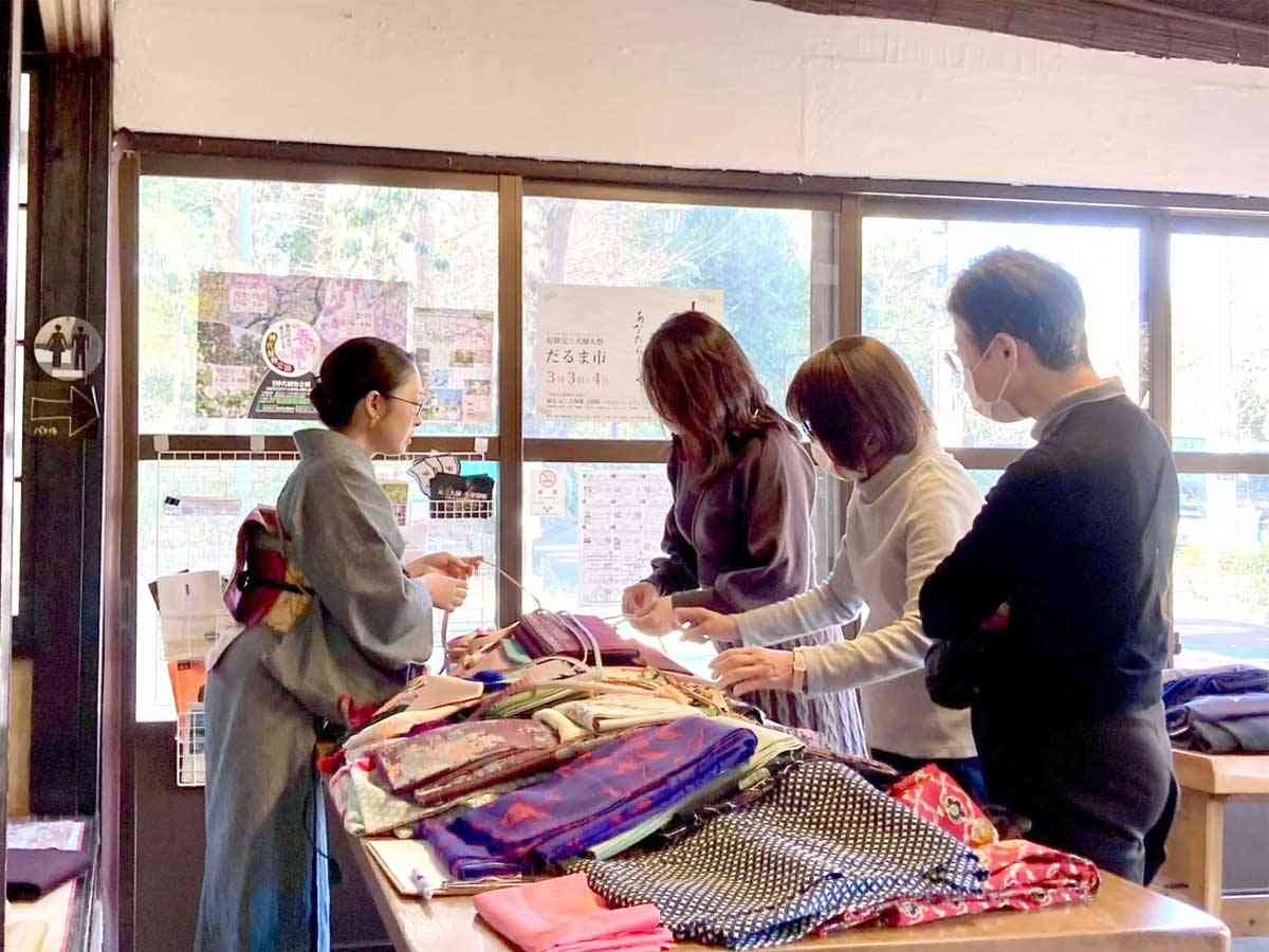 深大寺の空き店舗で着物のレンタルや着付けをする「ひなあそび」のまちゼミ風景。着物を着るシチュエーションやコーディネートについて学べる