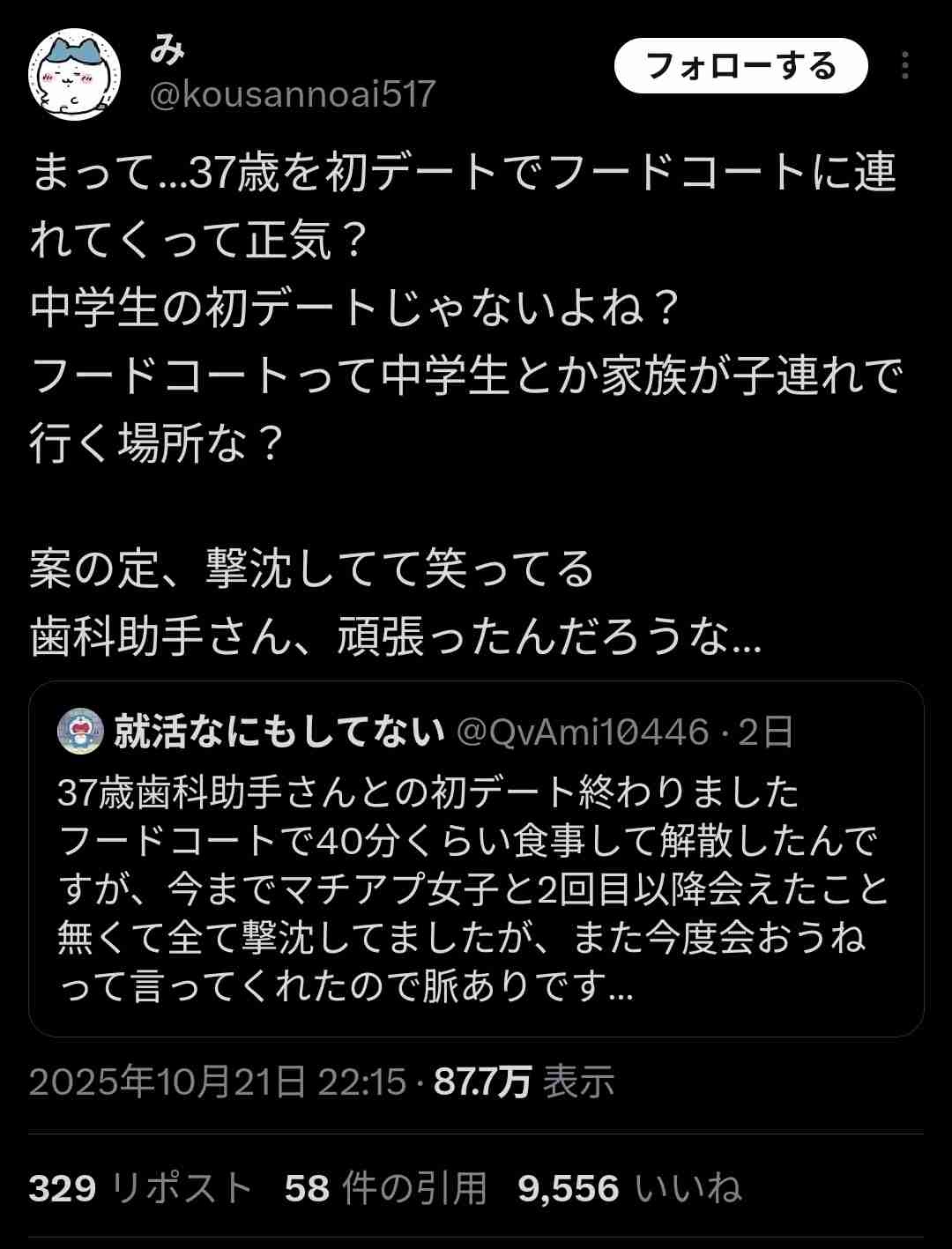 よく37女とフードコートとはいえデートできたな。日給1万円もらってもギリいやだわ