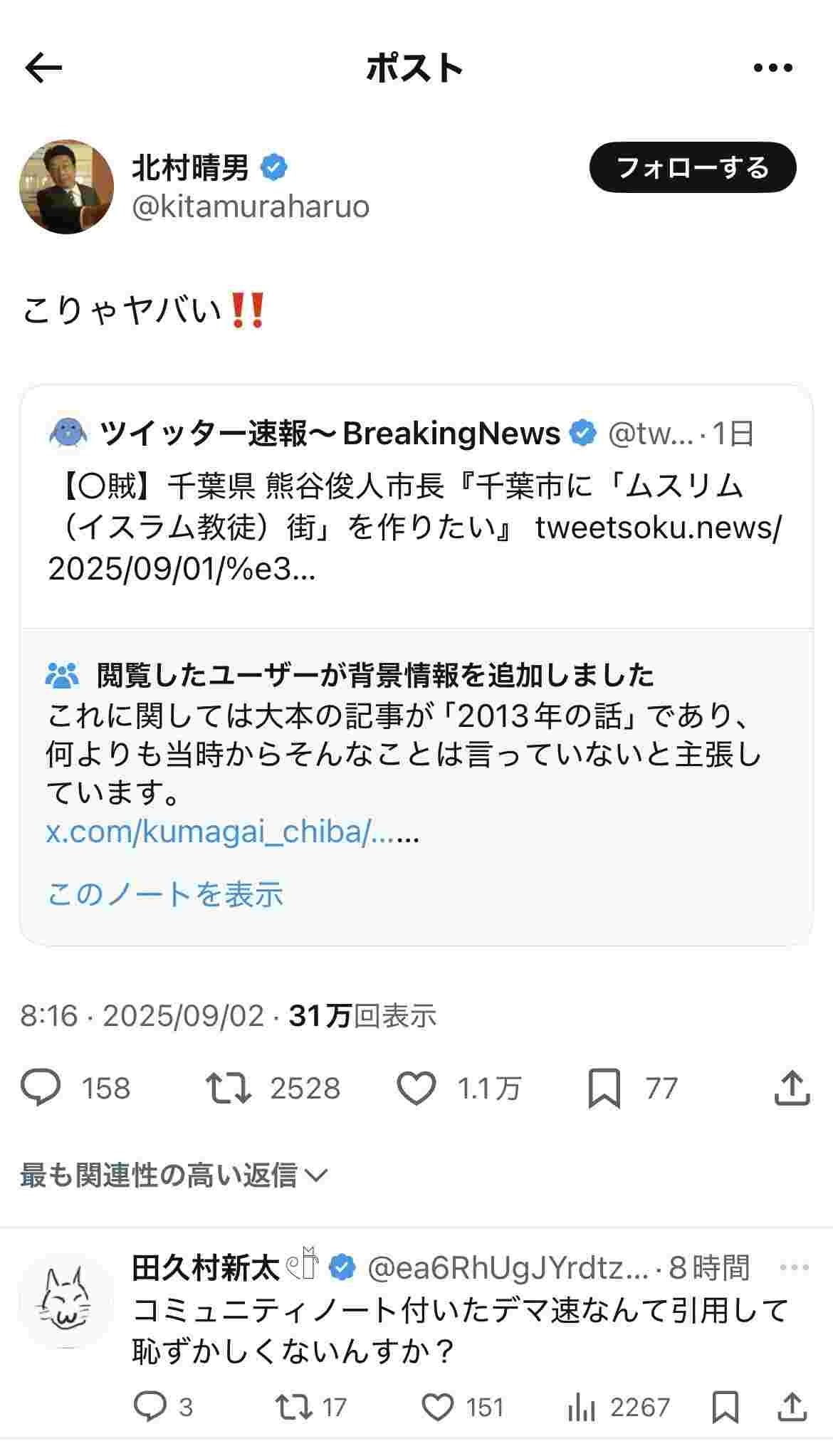 北村晴男さん(反石破)、コミュニティノートがついたデマを「こりゃヤバい‼」と拡散。完全にネトウヨ議員
