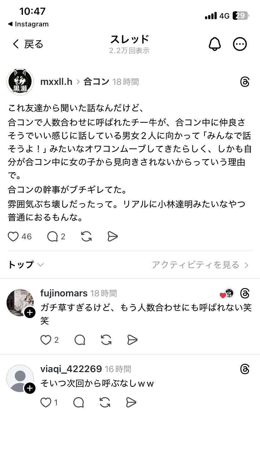 合コンで人数合わせに呼ばれたチー牛が、合コン中に仲良さそうでいい感じに話している男女2人に向かって「みんなで話そうよ!」みたいなオワコンムーブしてきたらしく、しかも自分が合コン中に女の子から見向きされないからっていう理由で。