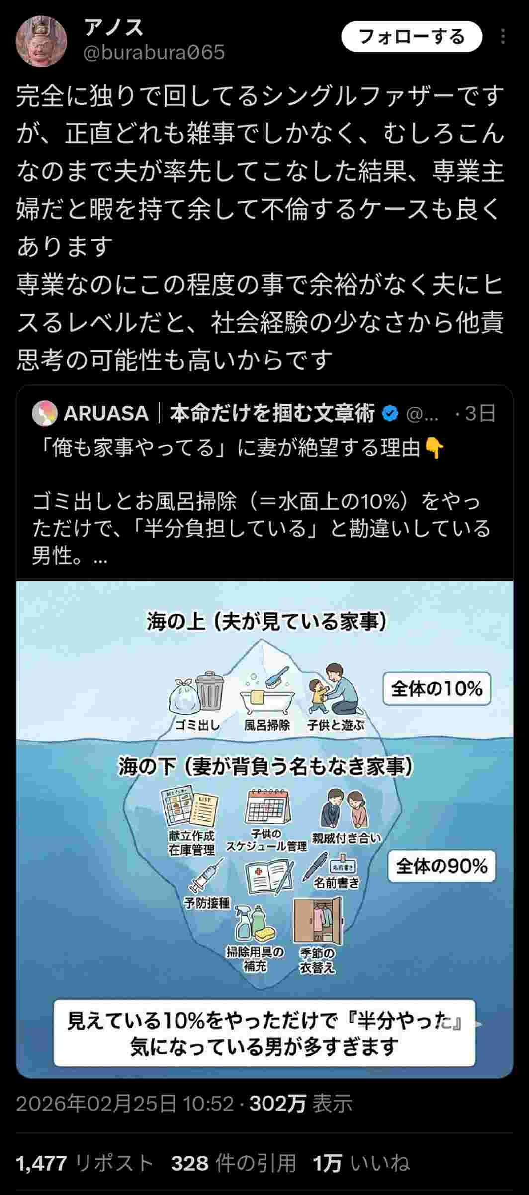 女「男には見えてない名もなき家事がある」シンパパ「ただの雑務レベルっすよそれ」→大炎上www