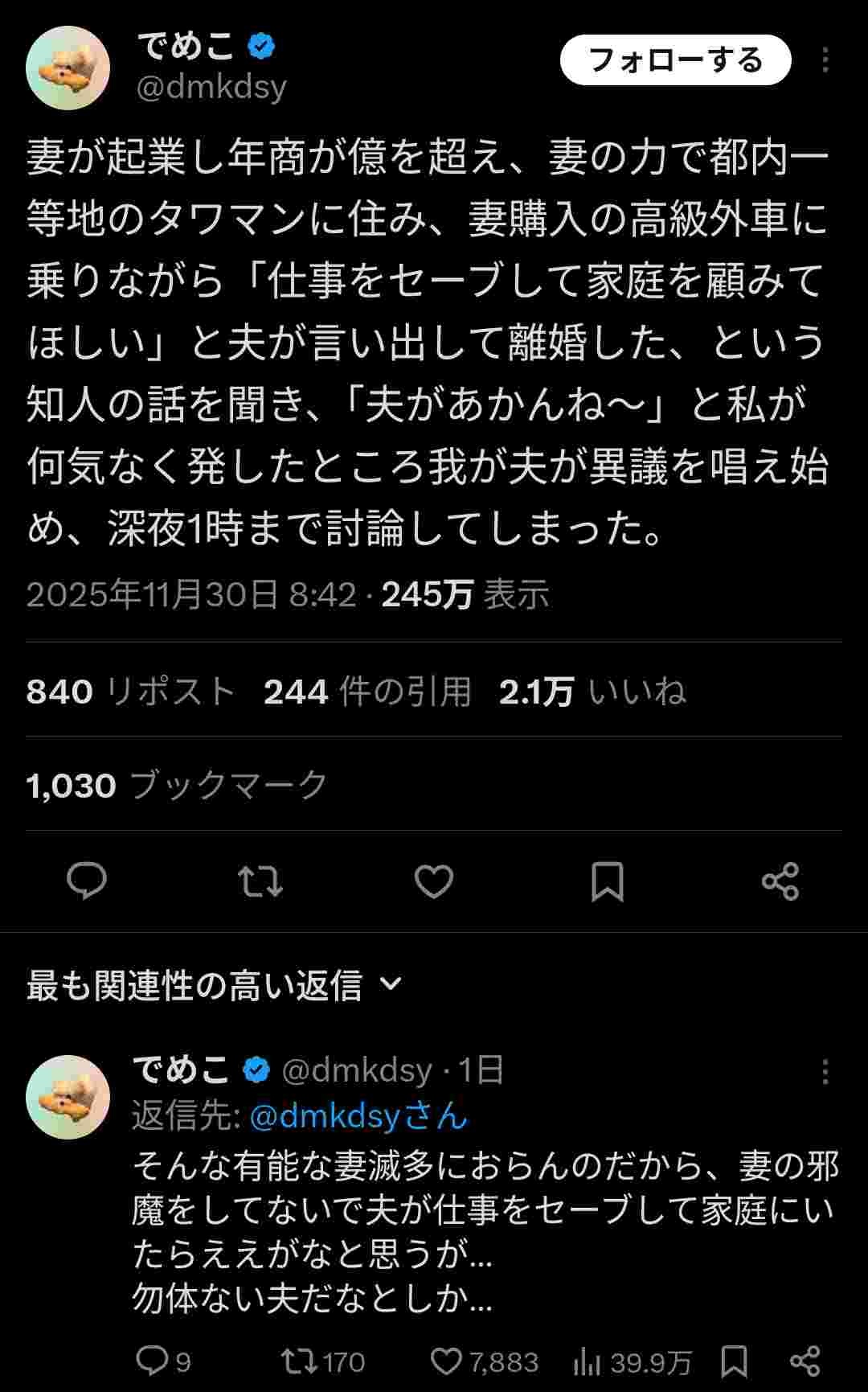 これ逆にめっちゃ稼いでる夫に家庭優先してって言って離婚された女だったらかわいそうってなるじゃん