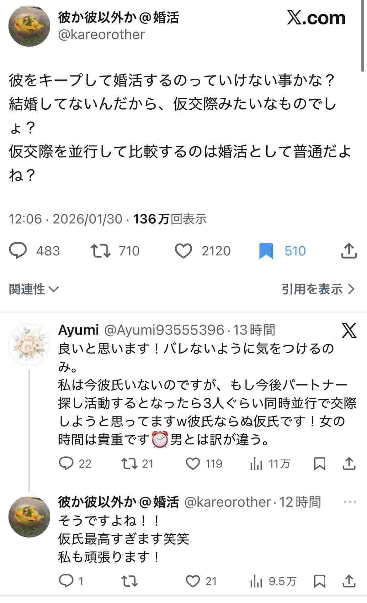 私は今彼女いないのですが、もし今後パートナー 探し活動するとなったら3人ぐらい同時並行で交際 しようと思ってますw彼女ならぬ仮女です! 男の 時間は貴重です⏰ 女とは訳が違う。