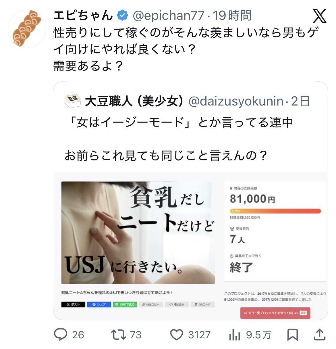 性を売れることがうらやましいっていうのは需要の話じゃなくてプライドの話だと思うの