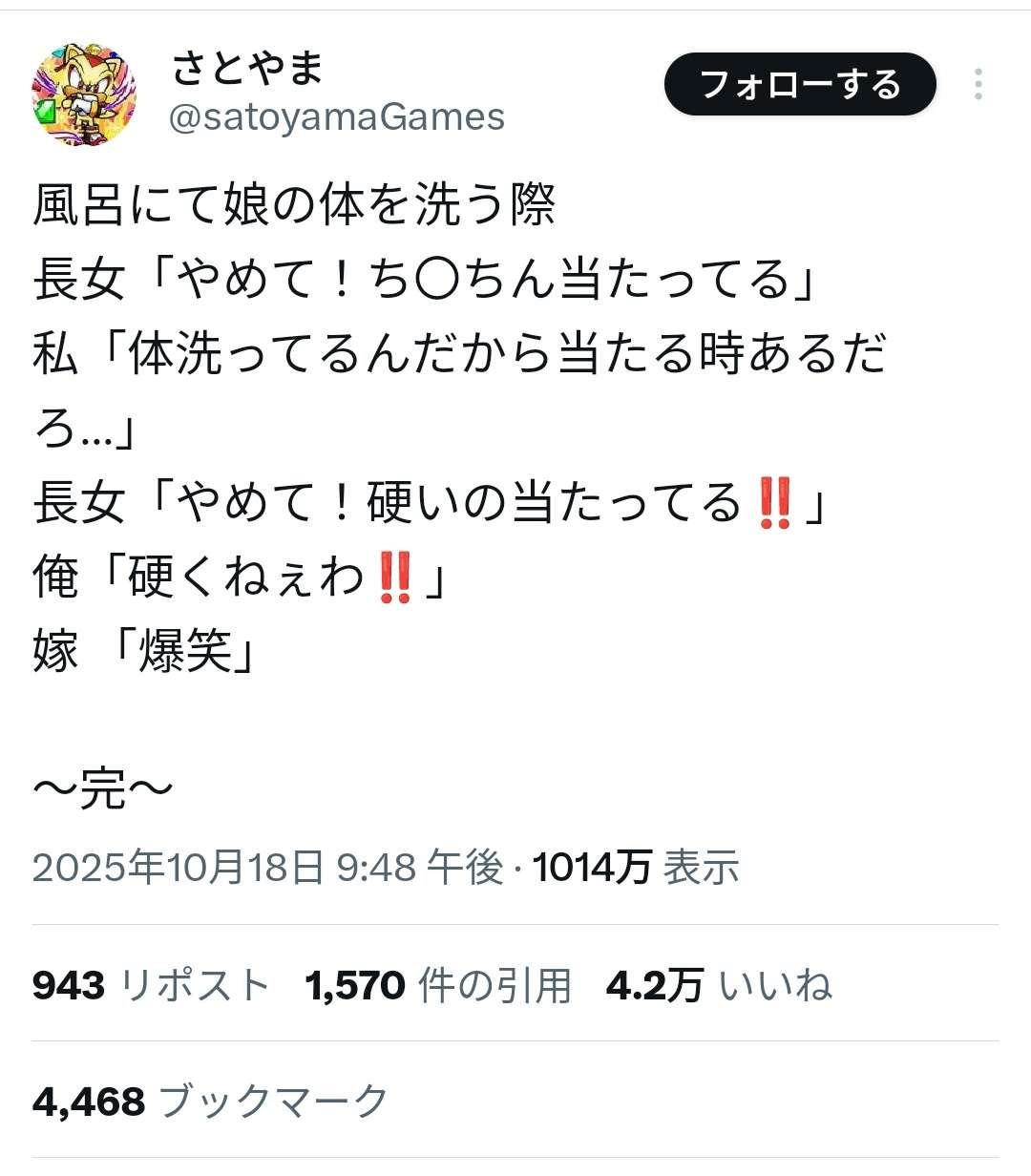 嫁が爆笑してるけど、おまえには硬くならずに娘に硬くなってるだとしたら笑ってる場合じゃないだろ