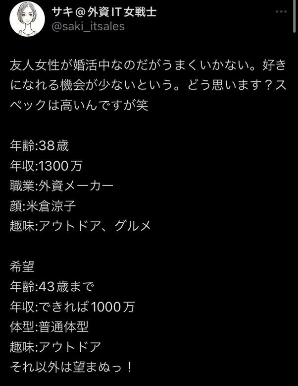 こいつは相手に年収求めてるのが草よな、養ってやるくらいの気持ちでようやくな段階なのに