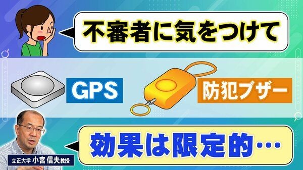 さらに、GPSは、犯罪者側にバレてしまうと悪用される恐れがある。犯人が子供からGPSを取り上げ、その場に捨てて子供を連れ去った。警察は捨てられたGPSのある誘拐現場に集中してしまうが、すでに犯人はその場を立ち去っていて対応が遅れたことが実際にあったといいます。小宮教授は「GPSを付けるなら見つからない場所に」と話します。