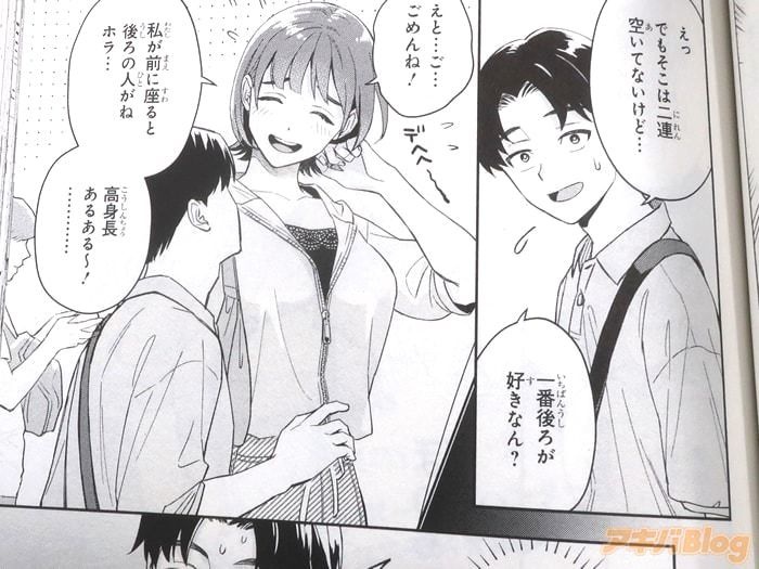 今回発売になったコミックス「僕の彼女はデッカワイイ」2巻【AA】には第5話~第10話を収録し、オビ謳い文句は『すぐそこにあるのにとどかない、そんな距離感が気持ちいい』で、裏表紙は『いま最高に推せる身長差カップルのお話』だった。